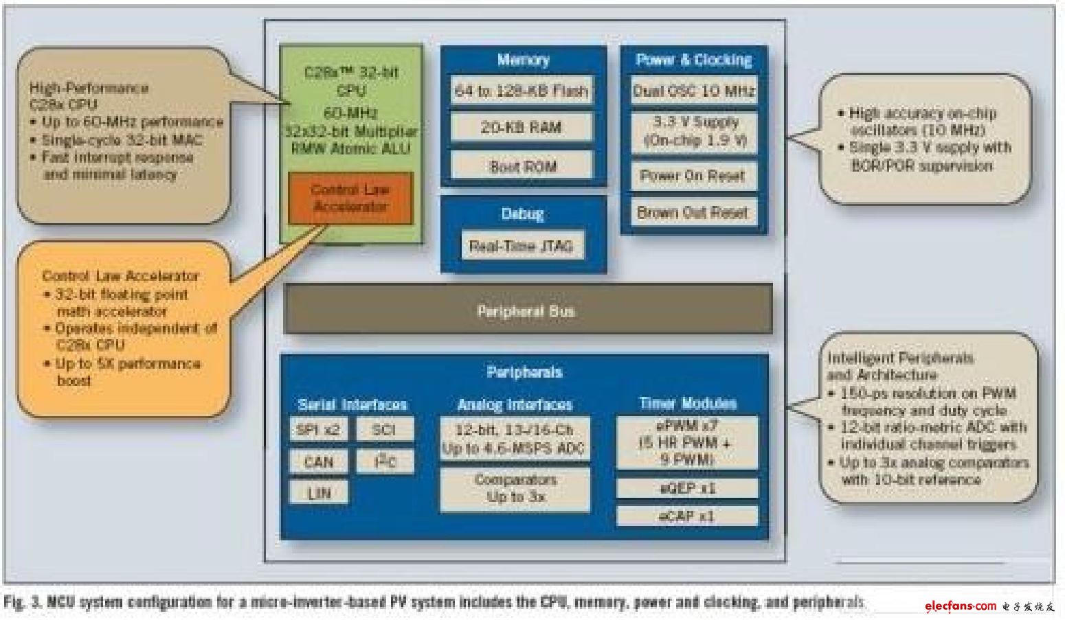 圖3:面向基于微逆變器PV 的系統(tǒng)的MCU 系統(tǒng)包含CPU、存儲器、電源及時鐘、外設。