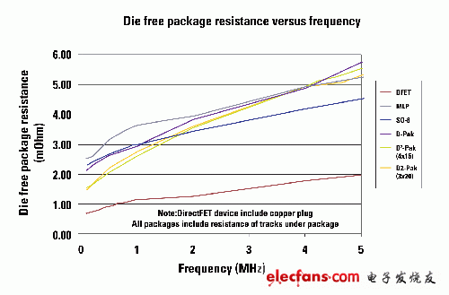 從這些圖可以看出,DirectFET封裝與DPAK、D2PAK、SO8 和微型引線框封裝(MLP)等其他封裝相比,相對于頻率帶來的電阻和電感可忽略不計(jì)。此外,DirecFET相對于帶引腳的封裝,其寄生感應(yīng)值的變化最小,因?yàn)槟軌驇黼娮韬碗姼械姆庋b已被降至最低程度。隨著不久前對DirecFET材料和結(jié)構(gòu)的改進(jìn),這種封裝的電阻降至0.15 mΩ,寄生電感降低0.1 nH以下。唯一在封裝電阻和電感方面與DirectFET接近的封裝是MLP——PQFN的變體。