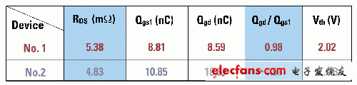 為進(jìn)一步闡明上述的內(nèi)容和更好地了解C dv/dt損耗對整個(gè)電路損耗的影響,讓我們用兩個(gè)MOSFET(參數(shù)如表1所示)例說明。1號(hào)器件具備高通態(tài)電阻和低電荷比值,而2號(hào)器件是具備低通態(tài)電阻和高電荷比值的晶體管。將這兩個(gè)器件插入同步壓降轉(zhuǎn)換器具備相同的Q1 MOSFET和1 MHz開關(guān)頻率的同步FET插槽。輸入電 壓為14 V,輸出電壓為1.3 V。