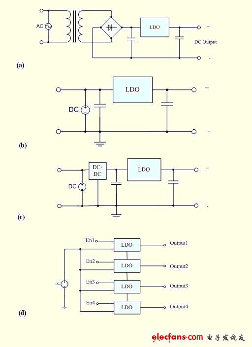 LDO是低壓降的意思,這有一段說明:低壓降(LDO)線性穩(wěn)壓器的成本低,噪音低,靜態(tài)電流小,這些是它的突出優(yōu)點(diǎn)。它需要的外接元件也很少,通常只需要一兩個(gè)旁路電容。新的LDO線性穩(wěn)壓器可達(dá)到以下指標(biāo):輸出噪聲30μV,PSRR為60dB,靜態(tài)電流6μA,電壓降只有100mV。LDO線性穩(wěn)壓器的性能之所以能夠達(dá)到這個(gè)水平,主要原因在于其中的調(diào)整管是用P溝道MOSFET,而普通的線性穩(wěn)壓器是使用PNP晶體管。P溝道MOSFET是電壓驅(qū)動(dòng)的,不需要電流,所以大大降低了器件本身消耗的電流;另一方面,采用PNP晶體管的電路中,為了防止PNP晶體管進(jìn)入飽和狀態(tài)而降低輸出能力, 輸入和輸出之間的電壓降不可以太低;而P溝道MOSFET上的電壓降大致等于輸出電流與導(dǎo)通電阻的乘積。由於MOSFET的導(dǎo)通電阻很小,因而它上面的電壓降非常低。
