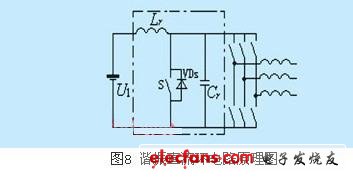 在逆變器直流母線與直流輸入端之間加入一個(gè)輔助lc諧振回路,如圖8所示,工作時(shí)啟動(dòng)lc電路不斷地諧振,使并聯(lián)在直流母線上的電容電壓vc周期性地變 為零,從而為后面的逆變橋的開(kāi)關(guān)器件創(chuàng)造零電壓開(kāi)關(guān)條件。該電路中電壓vc的諧振峰值很高,增加了對(duì)開(kāi)關(guān)器件耐壓的要求。