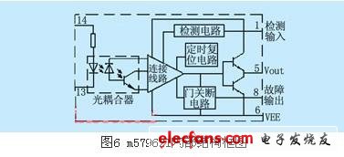 如圖6所示,IGBT的驅(qū)動(dòng)模塊m57962l上自帶保護(hù)功能,檢測(cè)電路 檢測(cè)到檢測(cè)輸入端1腳為15v高電平時(shí),判定為電流故障,立即啟動(dòng)門關(guān)斷電路,將輸出端5腳置低電平,使IGBT截止,同時(shí)輸出誤差信號(hào)使故障輸出端8腳 為低電平,以驅(qū)動(dòng)外接保護(hù)電路工作,延時(shí)8~10μs封鎖驅(qū)動(dòng)信號(hào),這樣能很好地實(shí)現(xiàn)過(guò)流保護(hù)。經(jīng)1~2ms延時(shí)后,如果檢測(cè)出輸入端為高電平,則 m57962l復(fù)位至初始狀態(tài)。