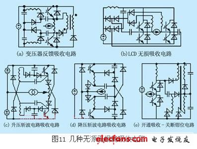 實(shí)現(xiàn)橋臂無(wú)損吸收見(jiàn)諸文獻(xiàn)的大約有如圖11所示幾種。圖11(a)(e)[12]電路從理論上實(shí)現(xiàn)了逆變器橋臂的無(wú)源無(wú)損吸收,但用作能量回饋的變壓器,其副邊的二極管耐壓值過(guò)高是該電路的致命弱點(diǎn);