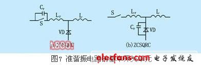 如圖7所示(a)(b)分別為零電壓準(zhǔn)諧振電路和零電流準(zhǔn)諧振電路,這類變換器的諧振元件只參與能量變換的某一階段而不是全過(guò)程,一般采用脈沖頻率調(diào)制法調(diào)控輸出電壓和輸出功率。