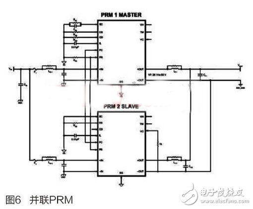 為了并聯(lián)PRM模塊(圖6),需要使用并聯(lián)信號(hào)(PR引腳)來(lái)實(shí)現(xiàn)各個(gè)模塊的均流,同時(shí),具體模塊的啟用/禁用信號(hào)(PC引腳)需要連接來(lái)同時(shí)啟動(dòng)所有模塊。如圖6所示,一個(gè)PRM模塊可設(shè)置為一個(gè)電源陣列中的“主”,以驅(qū)動(dòng)其他負(fù)責(zé)反饋和穩(wěn)壓的“從”PRM模塊。