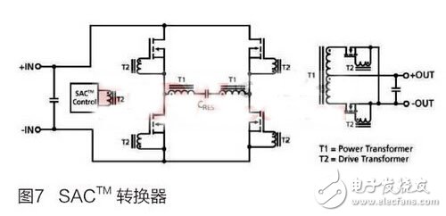 SAC是基于變壓器的串聯(lián)諧振拓?fù)浣Y(jié)構(gòu),它在等于初級(jí)側(cè)儲(chǔ)能電路諧振諧振頻率的固定頻率下工作。初級(jí)側(cè)的開關(guān)FET被鎖定在初級(jí)的自然諧振頻率,在零交叉點(diǎn)來(lái)開關(guān),從而消除了開關(guān)中的功耗,提高了效率并大大減少了高階噪聲諧波的產(chǎn)生。初級(jí)的諧振回路是純正弦波(圖7所示),從而可降低諧波含量,提供了更干凈的輸出噪聲頻譜。由于SAC的高工作頻率,可使用較小的變壓器來(lái)提高功率密度和效率。