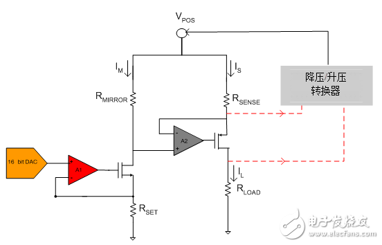 圖2:具有降壓/升壓轉(zhuǎn)換器的高端電壓—電流轉(zhuǎn)換器