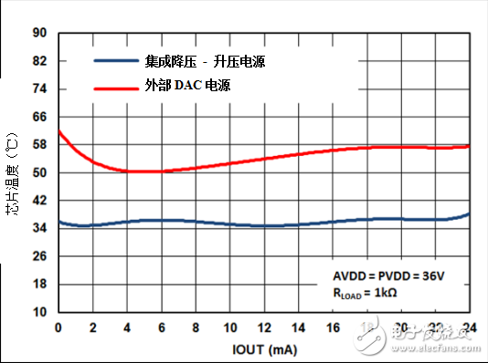 DAC8775的效率也導(dǎo)致需要更多的熱優(yōu)化系統(tǒng)。在具有和不具有自適應(yīng)功率反饋電路的四通道設(shè)計(jì)中比較芯片的結(jié)溫顯示了芯片溫度的顯著改善。圖3和圖4所示為DAC8775的測(cè)量結(jié)果,比較了在1Ω和1kΩ RLOAD情況下,使用和不使用降壓/升壓轉(zhuǎn)換器的模溫。從圖3可以看出,這種技術(shù)可以將結(jié)溫提高至高達(dá)36°C。