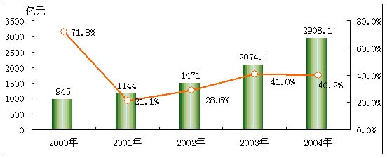 圖1 2000-2004年中國(guó)集成電路市場(chǎng)銷售額規(guī)模與增長(zhǎng)