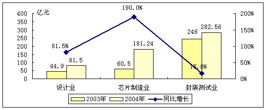 圖4 2004年中國(guó)集成電路產(chǎn)業(yè)各價(jià)值鏈銷售收入及增長(zhǎng)