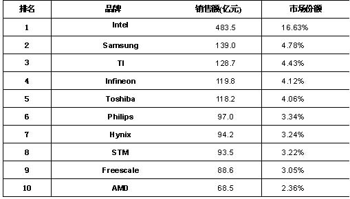 根據(jù)對(duì)2004年中國(guó)集成電路市場(chǎng)的調(diào)查數(shù)據(jù),賽迪顧問(wèn)對(duì)2004年中國(guó)集成電路市場(chǎng)主力廠商進(jìn)行了排名。其中,Intel以16.63%的市場(chǎng)份額高居榜首,三星則由2003年的第四位上升到第二位的位置。