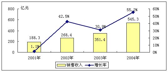圖3 2001-2004年中國(guó)集成電路產(chǎn)業(yè)銷售收入規(guī)模及增長(zhǎng)