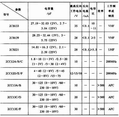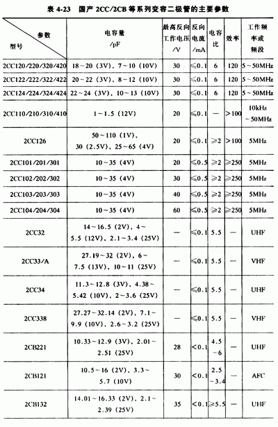 2.常用的變?nèi)荻O管 常用的國(guó)產(chǎn)變?nèi)荻O管有2CC系列和2CB系列,表4-23為其主要參數(shù)。