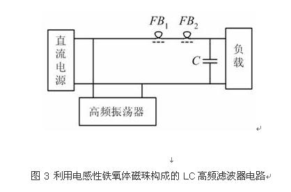 由于鐵氧體磁珠在電路中使用能夠增加高頻損耗而又不引入直流損耗,而且體積小、便于安裝在區(qū)間的引線或者導(dǎo)線上,對(duì)于1MHz以上的噪聲信號(hào)抑制效果十分明顯,因此可用作高頻電路的去耦、濾波以及寄生振蕩的抑制等。特別對(duì)消除電路內(nèi)部由開(kāi)關(guān)器件引起的電流突變和濾波電源線或其它導(dǎo)線引入電路的高頻噪聲干擾效果明顯。低阻抗的供電回路、諧振電路、丙類功率放大器以及可控硅開(kāi)關(guān)電路等,使用鐵氧體磁珠進(jìn)行濾波都是十分有效的。鐵氧體磁珠一般可以分為電阻性和電感性兩類,使用時(shí)可以根據(jù)需要選取。單個(gè)磁珠的阻抗一般為十至幾百歐姆,應(yīng)用時(shí)如果一個(gè)衰減量不夠時(shí)可以用多個(gè)磁珠串聯(lián)使用,但是通常三個(gè)以上時(shí)效果就不會(huì)再明顯增加了[7]。如圖3示出了利用兩只電感性鐵氧體磁珠構(gòu)成的高頻LC濾波器電路,該電路可有效的吸收由高頻振蕩器產(chǎn)生的振蕩信號(hào)而不致竄入負(fù)載,并且不降低負(fù)載上的直流電壓。