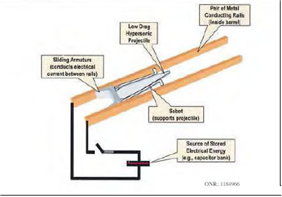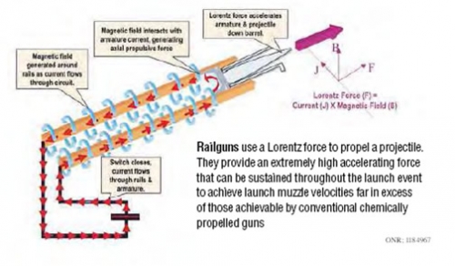 電磁軌道炮是使用電磁加速技術(shù)發(fā)射彈丸的一種電能武器。在發(fā)射過程中,強大的電磁力(也稱洛侖茲力)使彈丸達到極高的初速度飛離炮管口,這種初速度比常規(guī)化學推進劑發(fā)射的彈丸的初速度要高得多,并且射程也要遠。因而,該型武器引起了美國海軍人員的關注。電磁炮在其未來武器的發(fā)展計劃中,已成為越來越重要的部分。