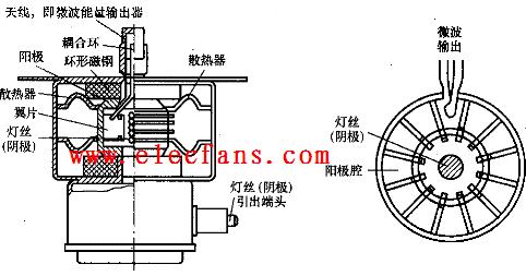 25731 本文主要介紹了磁控管結(jié)構(gòu)及其工作原理。磁控管是微波爐的關(guān)鍵器件,主要由管芯和磁鐵兩部分構(gòu)成,如圖1。管芯由陰極、燈絲、陽極、天線(波導(dǎo)管)等構(gòu)成。