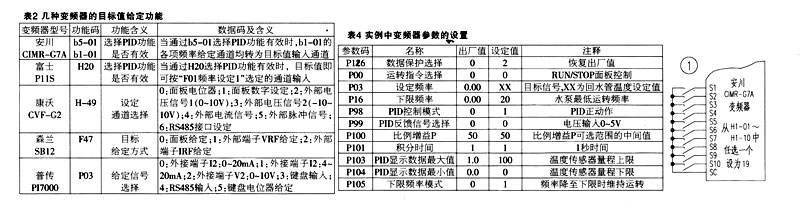 如何將目標(biāo)值 ( 目標(biāo)信號(hào) ) 的命令信息傳送給變頻器,各種變頻器選擇了不同的方法,而歸結(jié)起來大體上有如下兩種方案:一是自動(dòng)轉(zhuǎn)換法,即變頻器預(yù)置 PID 功能有效時(shí),其開環(huán)運(yùn)行時(shí)的頻率給定功能自動(dòng)轉(zhuǎn)為目標(biāo)值給定.如表 2 中的安川 CIMR-G 7A 與富士 P11S 變頻器。二是通道選擇法,如表 2 中的康沃 CVF-G2 、森蘭 SB12 和普傳 P17000 系列變頻器。