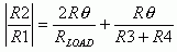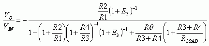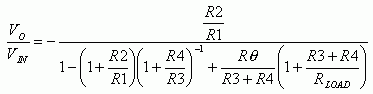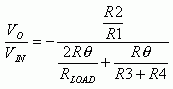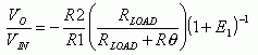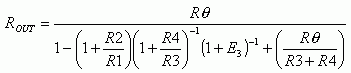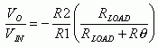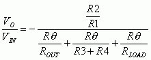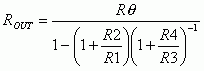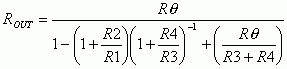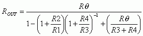 Active Synthesis of Output ImpedanceFortunately, a method exists to set output impedance and reduce the gain loss. The careful use of positive feedback around a voltage difference amplifier boosts a low-value output current-sensing resistor to the required final value.![]() Figure 2. Single Op Amp active termination. Note in Figure 2 that forward current into the load, IFORWARD, is determined by VO / RLOAD. Synthesised output impedance ROUT is determined by VO/IREVERSE, when VIN is zero. Figure 2 shows a single op amp with both negative and positive feedback loops setting gain and output impedance. RΘ is placed in series with the load, and is used to sample the current into the load. Positive feedback through R3 and R4 is used to boost the effect of RΘ. For circuit stability, negative feedback must dominate the proceedings, and this fact limits the amount of boost available. The open-loop output resistance of the op amp is included to allow for the situation when ROOL becomes close in value to RΘ at high frequencies as the loop gain rolls off. Voltage Gain for Figure 2 is given by: ![]() Error term is given by: ![]() Output Impedance for Figure 2 is given by: ![]() Errors due to finite open-loop gain of the op amp are shown. Note that the overall input-to-output signal path in Figure 2 is inverting. Assuming infinite open-loop gain from an ideal op amp, output impedance is: ![]() Generally, the term [RΘ / [R3 + R4]] is << [1 + R2 / R1][1 + R4 / R3]-1, so may be ignored. ![]() Assuming infinite open-loop gain from an ideal op amp, voltage gain is: ![]() Rearranging the output impedance into the gain equation: ![]() In general, RLOAD = ROUT for reverse-termination applications. Thus: ![]() Figure 2 Advantages: