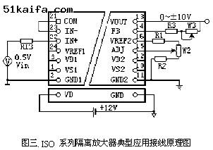 三、典型應(yīng)用技術(shù) 圖三、為ISO系列隔離放大器典型應(yīng)用接線原理圖,其中輸入和輸出放大器都為跟隨方式。此時隔離放大器的整體放大倍數(shù)為20倍,R1,R2和W1為調(diào)零電路,R1=5.1K R2=2K W1=2K(多圈電位器)。