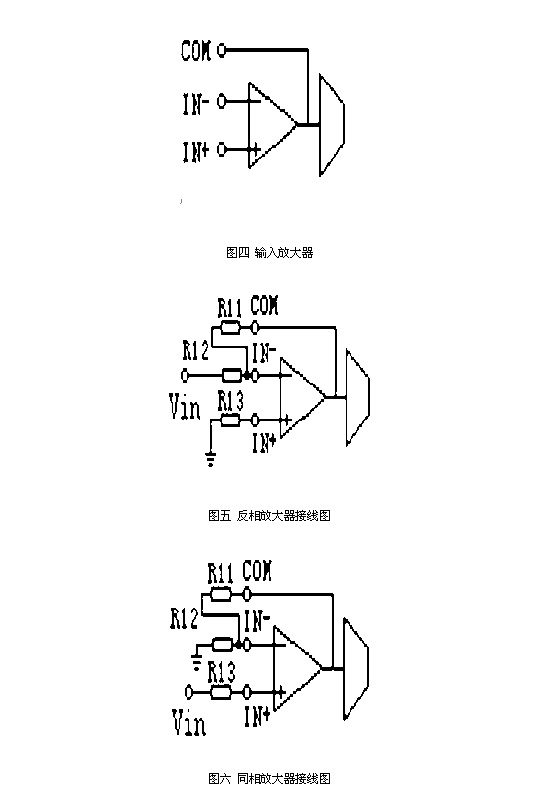 圖四 為輸入放大器電路,當(dāng)輸入放大器輸出(21腳COM端)為0.5V時,輸出即為5V(13和14腳短接時)。輸入反相放大電路: 圖五 為輸入反相放大電路接線圖,其中放大倍數(shù)為:Kin=-R11/R12 R3=R11//R12例如:當(dāng)輸入Vin為0~-100mV,輸出為0~5V時,可以?。篟11=50K R12=10K R13=8.3K 放大倍數(shù):Kin=-50/10=-5輸入同相放大電路: 圖六 為輸入同相放大電路接線圖,其放大倍數(shù)為:Kin=1+R2/R1