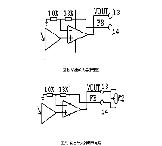 ISO1001 為用戶設(shè)計(jì)了一個輸出放大器,其原理如圖七所示,F(xiàn)B為放大器的反相輸入端,當(dāng)13和14腳短接時,輸出放大倍數(shù)Kout=1+33/10=4.3,由于隔離放大器部分已有2.35倍的放大倍數(shù),所以,總放大倍數(shù)K=4.3*2.35=10.1。 當(dāng)輸入放大器的COM端電壓達(dá)不到0.5V時,可以通過輸出放大器調(diào)節(jié)放大倍數(shù),如圖八 所示,W2可以取1~100K(多圈電位器)。