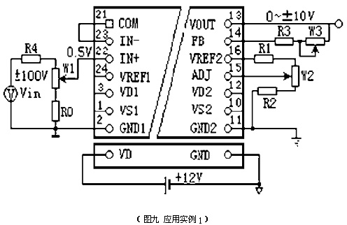 四、典型應(yīng)用實(shí)例 應(yīng)用實(shí)例1:用隔離放大器直接測量高電壓信號 輸入:0~±100VDC直流電壓信號 輸出:0~±10VDC隔離信號 取R4= 100K R0=390 W1=200(多圈電位器) 取R3=39K W3=10K(多圈電位器)R1=5.1K R2=2K W2=2K(多圈電位器) 當(dāng)輸入信號較小時可以采用圖六同相放大電路,使輸入放大器的輸出(即COM端電壓)為0.45~0.48V之間,其余與圖九相同。