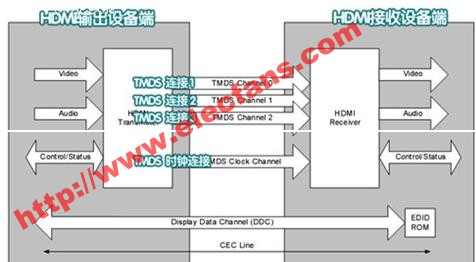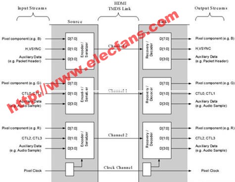 用于DVD, 機(jī)頂盒等音視頻source到TV,顯示器等sink設(shè)備的傳輸。傳輸基于的是TMDS(Transition Minimized Differential Signaling)協(xié)議。此外,使用TMDS也是DVI標(biāo)準(zhǔn)的主要特點(diǎn) 。 2 物理結(jié)構(gòu) 上圖是HDMI block結(jié)構(gòu)圖,可