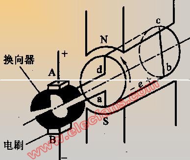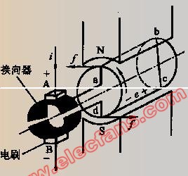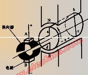 有刷直流電機的工作原理圖如圖所示。在有刷直流電機的固定部分有磁鐵,這里稱作主磁極;固定部分還有電刷。轉動部分有環(huán)形鐵芯和繞在環(huán)形鐵芯上的繞組。