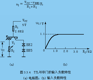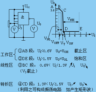 在保證輸出為標準高電平USH ( 常取USH=3V)時,允許輸入低電平的最大值稱為關門電平,用UOFF表示。由上圖可得UOFF≈1.0V。顯然,只有當輸入uI<UOFF時,與非門才關閉,輸出高電平。