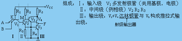 ①輸入有低電平0.3V: K點電位為1V V1導通 V2V5截止,V3V4導通。 (F為3.6V高電平。)