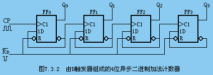 圖7.3.2所示為由D觸發(fā)器組成的4位異步二進(jìn)制加法計(jì)數(shù)器的邏輯圖。