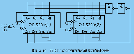 當(dāng)高位片CT74LS290(2)計(jì)到2、低位片計(jì)到3時(shí),兩級與非門輸出高電平1,加到異步置0端,使計(jì)數(shù)器回到初始的0狀態(tài),從而實(shí)現(xiàn)了二十三進(jìn)制計(jì)數(shù)。