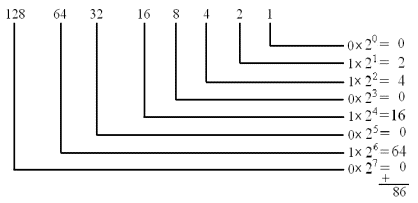 例題 1.3.2 試將二進(jìn)制數(shù)(01010110)B轉(zhuǎn)換為十進(jìn)制數(shù)。