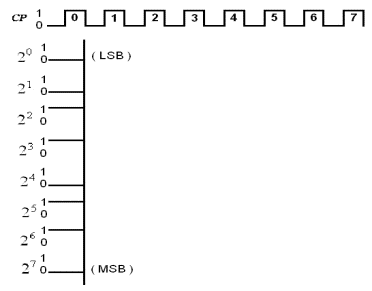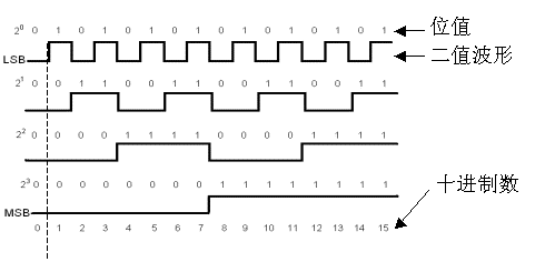 圖中給出了四個二進(jìn)制波形??催@種二進(jìn)制波形圖時,我們應(yīng)當(dāng)沿著圖中虛線所示的方向來看,即使圖中沒有標(biāo)出虛線(一般都沒有標(biāo)出),也要想象出虛線來。其中在每一個波形上方的數(shù)字表示了與波形對應(yīng)的位的數(shù)值,最后一行則是相應(yīng)的十進(jìn)制數(shù) ,其中LSB是英文Least Significant Bit的縮寫,表示最低位,MSB是Most Significant Bit的縮寫,表示二進(jìn)制數(shù)的最高位。顯然,這是一組4位的二進(jìn)制數(shù),總共有16組,最左邊的二進(jìn)制數(shù)為0000,最上邊的波形代表二進(jìn)制數(shù)的最低位,也就是通常在十進(jìn)制數(shù)中我們所說的個位數(shù),最下面的是最高位。圖中最右邊的二進(jìn)制數(shù)為1111,對應(yīng)的十進(jìn)制數(shù)為15。再來看看對應(yīng)于十進(jìn)制數(shù)5的二進(jìn)制數(shù)是多少呢?是0101,對了,讀數(shù)的順序是從下往上。