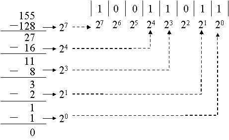 現(xiàn)在我們來看看155這個十進(jìn)制數(shù),與2的各個冪次方數(shù)比較后可知,與155最近的是128,即27,155減去128后余數(shù)為27,而27最接近的是24,27減去16得到11,11減去8(23)得到3,3減去2(21)得到1,1減去1(20)得到0。由于在本次計算中得到2的最高冪次為7,因此可以得知對應(yīng)的二進(jìn)制數(shù)是一個八位的二進(jìn)制數(shù),寫出這個二進(jìn)制數(shù)的位權(quán),并將其與得到的五個2的冪次方數(shù)對比后填入1,其余的用
