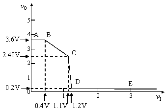 AB段:此時(shí)輸入電壓vI很低,T1的發(fā)射結(jié)為正向偏置。在穩(wěn)態(tài)情況下,T1飽和致使T2和T3截止,同時(shí)T4導(dǎo)通。輸出vo=3.6V為高電平。