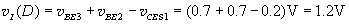 CD段:當(dāng)vI的值繼續(xù)增加并超越C點(diǎn),使T3飽和導(dǎo)通,輸出電壓迅速下降至v0≈0.2V。D點(diǎn)處的vI(D)值,可以根據(jù)T2、T3兩發(fā)射結(jié)電壓VF≈0.7V來估算。因此有