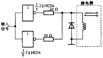 在工程實(shí)踐中,往往會(huì)遇到用各種數(shù)字電路以控制機(jī)電性系統(tǒng)的功能,如控制電動(dòng)機(jī)的位置和轉(zhuǎn)速,繼電器的接通與斷開(kāi),流體系統(tǒng)中的閥門(mén)的開(kāi)通和關(guān)閉,自動(dòng)生產(chǎn)線中的機(jī)械手多參數(shù)控制等。下面以繼電器的接口電路為例來(lái)說(shuō)明。在繼電器的應(yīng)用中,繼電器本身有額定的電壓和電流參數(shù)。一般情況下,需用運(yùn)算放大器以提升到必須的數(shù)一模電壓和電流接口值。對(duì)于小型繼電器,可以將兩個(gè)反相器并聯(lián)作為驅(qū)動(dòng)電路,如下圖所示。