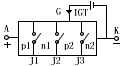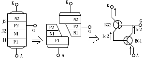 1505 可控硅是P1N1P2N2四層三端結(jié)構(gòu)元件,共有三個PN結(jié),分析原理時,可以把它看作由一個PNP管和一個NPN管所組成,其等效圖解如圖1所示