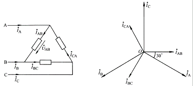 對于△形聯(lián)結(jié)的對稱三相負(fù)載,如圖4-3-6所示,各相電壓即等于對應(yīng)端線間的線電壓,如果線電壓為對稱三相電壓,即有: