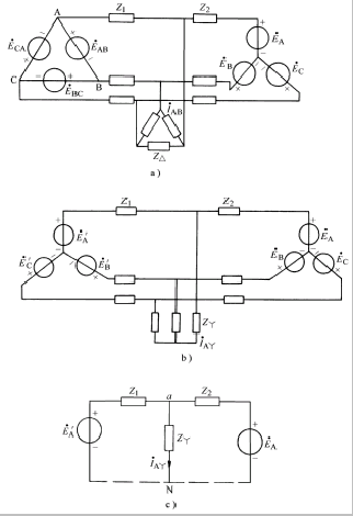 解:為畫出單相圖,需將△形聯(lián)結(jié)的電源與△形聯(lián)結(jié)的負(fù)載轉(zhuǎn)換為Y形聯(lián)結(jié),如圖4-3-8b。