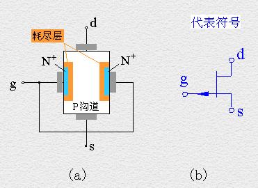 如圖1(a)所示,在一塊N型半導(dǎo)體材料的兩邊各擴(kuò)散一個(gè)高雜質(zhì)濃度的P+區(qū),就形成兩個(gè)不對(duì)稱的P+N結(jié),即耗盡層。把兩個(gè)P+區(qū)并聯(lián)在一起,引出一個(gè)電極g,稱為柵極,在N型半導(dǎo)體的兩端各引出一個(gè)電極,分別稱為源極s和漏極d。它們分別與三極管的基極b、發(fā)射極e和集電極c相對(duì)應(yīng)。夾在兩個(gè)P+N結(jié)中間的N區(qū)是電流的通道,稱為導(dǎo)電溝道(簡(jiǎn)稱溝道)。這種結(jié)構(gòu)的管子稱為N溝道結(jié)型場(chǎng)效應(yīng)管,它在電路中用圖1(b)所示的符號(hào)表示,柵極上的箭頭表示柵-源極間的P+N結(jié)正向偏置時(shí),柵極電流的方向(由P區(qū)指向N區(qū))。