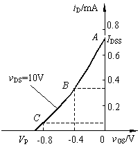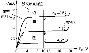 上述分析表明,改變柵源電壓vGS的大小,可以有效地控制溝道電阻的大小。若同時(shí)在漏源-極間加上固定的正向電壓vDS,則漏極電流iD將受vGS的控制,|vGS|增大時(shí),溝道電阻增大,iD減小。上述效應(yīng)也可以看作是柵-源極間的偏置電壓在溝道兩邊建立了電場(chǎng),電場(chǎng)強(qiáng)度的大小控制了溝道的寬度,即控制了溝道電阻的大小,從而控制了漏極電流iD的大小。 2.vDS對(duì)iD的影響 (a)vDS 圖3 設(shè)vGS值固定,且VP 在vDS較小時(shí),它對(duì)iD的影響應(yīng)從兩個(gè)角度來分析:一方面vDS增加時(shí),溝道的電場(chǎng)強(qiáng)度增大,iD隨著增加;另一方面,隨著vDS的增加,溝道的不均勻性增大,即溝道電阻增加,iD應(yīng)該下降,但是在vDS較小時(shí),溝道的不均勻性不明顯,在漏極附近的區(qū)域內(nèi)溝道仍然較寬,即vDS對(duì)溝道電阻影響不大,故iD隨vDS增加而幾乎呈線性地增加。隨著vDS的進(jìn)一步增加,靠近漏極一端的P+N結(jié)上承受的反向電壓增大,這里的耗盡層相應(yīng)變寬,溝道電阻相應(yīng)增加,iD隨vDS上升的速度趨緩。 當(dāng)vDS增加到vDS=vGS-VP,即vGD=vGS -vDS=VP(夾斷電壓)時(shí),漏極附近的耗盡層即在A點(diǎn)處合攏,如圖3(b)所示,這種狀態(tài)稱為預(yù)夾斷。與前面講過的整個(gè)溝道全被夾斷不同,預(yù)夾斷后,漏極電流iD≠0。因?yàn)檫@時(shí)溝道仍然存在,溝道內(nèi)的電場(chǎng)仍能使多數(shù)載流子(電子)作漂移運(yùn)動(dòng),并被強(qiáng)電場(chǎng)拉向漏極。若vDS繼續(xù)增加,使vDS>vGS-VP,即vGD<VP時(shí),耗盡層合攏部分會(huì)有增加,即自A點(diǎn)向源極方向延伸,如圖3(c),夾斷區(qū)的電阻越來越大,但漏極電流iD卻基本上趨于飽和,iD不隨vDS的增加而增加。因?yàn)檫@時(shí)夾斷區(qū)電阻很大,vDS的增加量主要降落在夾斷區(qū)電阻上,溝道電場(chǎng)強(qiáng)度增加不多,因而iD基本不變。但當(dāng)vDS增加到大于某一極限值(用V(BR)DS表示)后,漏極一端P+N結(jié)上反向電壓將使P+N結(jié)發(fā)生雪崩擊穿,iD會(huì)急劇增加,正常工作時(shí)vDS不能超過V(BR)DS。 從結(jié)型場(chǎng)效應(yīng)管正常工作時(shí)的原理可知:① 結(jié)型場(chǎng)效應(yīng)管柵極與溝道之間的P+N結(jié)是反向偏置的,因此,柵極電流iG≈0,輸入阻抗很高。② 漏極電流受柵-源電壓vGS控制,所以場(chǎng)效應(yīng)管是電壓控制電流器件。③ 預(yù)夾斷前,即vDS較小時(shí),iD與vDS間基本呈線性關(guān)系;預(yù)夾斷后,iD趨于飽和。 P溝道結(jié)型場(chǎng)效應(yīng)管工作時(shí),電源的極性與N溝道結(jié)型場(chǎng)效應(yīng)管的電源極性相反。 4.1.2 結(jié)型場(chǎng)效應(yīng)管的曲線及參數(shù) 詳細(xì)文字說明: 由于結(jié)型場(chǎng)效應(yīng)管的柵極輸入電流iG≈0,因此很少應(yīng)用輸入特性曲線,常用的特性曲線有輸出特性曲線和轉(zhuǎn)移特性曲線。 1.輸出特性曲線 輸出特性曲線用來描述vGS取一定值時(shí),電流iD和電壓vDS間的關(guān)系,即 它反映了漏-源電壓vDS對(duì)iD的影響。 圖1是一個(gè)N溝道結(jié)型場(chǎng)效應(yīng)管的輸出特性曲線。由此圖可見,結(jié)型場(chǎng)效應(yīng)管的工作狀態(tài)可劃分為四個(gè)區(qū)域。 ???? ????????????? 圖1 (1) 可變電阻區(qū) 可變電阻區(qū)位于輸出特性曲線的起始部分,它表示vDS較小、管子預(yù)夾斷前,電壓vDS與漏極電流iD間的關(guān)系。 在此區(qū)域內(nèi)有VP<vGS≤0,vDS<vGS-VP。當(dāng)vGS一定,vDS較小時(shí),vDS對(duì)溝道影響不大,溝道電阻基本不變,iD與vDS之間基本呈線性關(guān)系。若?| vGS | 增加,則溝道電阻增大,輸出特性曲線斜率減小。所以,在vDS較小時(shí),源-漏極間可以看作是一個(gè)受vGS控制的可變電阻,故稱這一區(qū)域?yàn)榭勺冸娮鑵^(qū)。這一特點(diǎn)常使結(jié)型場(chǎng)效應(yīng)管被作為壓控電阻而廣泛應(yīng)用。 (2) 飽和區(qū)(也稱恒流區(qū)) 當(dāng)VP<vGS≤0且vDS≥vGS-VP時(shí),N溝道結(jié)型場(chǎng)效應(yīng)管進(jìn)入飽和區(qū),即圖中特性曲線近似水平的部分。它表示管子預(yù)夾斷后,電壓vDS與漏極電流iD間的關(guān)系。飽和區(qū)的特點(diǎn)是iD幾乎不隨vDS的變化而變化,iD已趨于飽和,但它受vGS的控制。 應(yīng)當(dāng)指出,圖1中左邊的虛線是可變電阻區(qū)與飽和區(qū)的分界線,是結(jié)型場(chǎng)效應(yīng)管的預(yù)夾斷點(diǎn)(vDS=vGS-VP)的軌跡。顯然,預(yù)夾斷點(diǎn)隨vGS改變而變化,vGS愈負(fù),預(yù)夾斷時(shí)的vDS越小。 (3) 擊穿區(qū) 管子預(yù)夾斷后,若vDS繼續(xù)增大,當(dāng)柵-漏極間P+N結(jié)上的反偏電壓vGD增大到使P+N結(jié)發(fā)生擊穿時(shí),iD將急劇上升,特性曲線進(jìn)入擊穿區(qū)。管子被擊穿后再不能正常工作。 (4) 截止區(qū)(又稱夾斷區(qū)) 當(dāng)柵-源電壓 2. 轉(zhuǎn)移特性曲線 轉(zhuǎn)移特性曲線用來描述vDS取一定值時(shí),iD與vGS間的關(guān)系的曲線,即 它反映了柵-源電壓vGS對(duì)iD的控制作用。 由于轉(zhuǎn)移特性和輸出特性都是用來描述vGS、vDS及iD間的關(guān)系的,所以轉(zhuǎn)移特性曲線可以根據(jù)輸出特性曲線繪出。作法如下:在圖1所示的輸出特性中作一條vDS=10V的垂線,將此垂線與各條輸出特性曲線的交點(diǎn)A、B和C所對(duì)應(yīng)的iD、vGS的值轉(zhuǎn)移到iD-vGS直角坐標(biāo)系中,即可得到轉(zhuǎn)移特性曲線