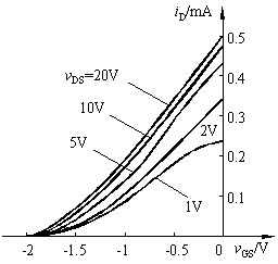 (圖中為vDS≥5V)后,不同vDS下的轉(zhuǎn)移特性曲線幾乎重合,這是因?yàn)樵陲柡蛥^(qū)內(nèi)iD幾乎不隨vDS而變。因此可用一條轉(zhuǎn)移特性曲線來表示飽和區(qū)中iD與vGS的關(guān)系。在飽和區(qū)內(nèi)iD可近似地表示為
