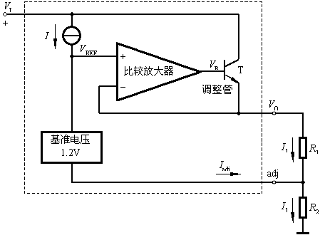 以LM317為例,其電路結(jié)構(gòu)和外接元件如圖1所示。它的內(nèi)部電路有比較放大器、偏置電路(圖中未畫出)、恒流源電路和帶隙基準(zhǔn)電壓VREF等,它的公共端改接到輸出端,器件本身無(wú)接地端。所以消耗的電流都從輸出端流出,內(nèi)部的基準(zhǔn)電壓(約1.2V)接至比較放大器的同相端和調(diào)整端之間。若接上外部的調(diào)整電阻R1、R2后,輸出電壓為
