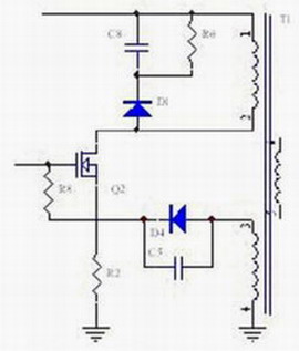 在開關(guān)管Q2截止期間,開關(guān)變壓器T1初級繞組存儲的能量經(jīng)次級繞組的耦合,二極管整流供負載。