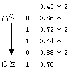 例如,將十進(jìn)制的0.43,轉(zhuǎn)換成二進(jìn)制小數(shù)的過程如下(假設(shè)要求小數(shù)點(diǎn)后取5位):