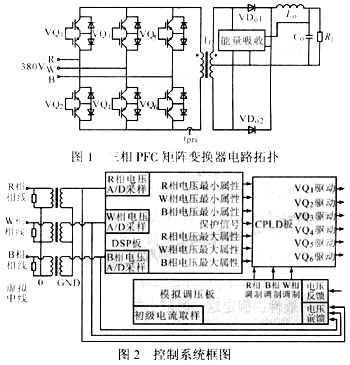 ??? 圖1示出三相PFC矩陣變換器電路拓?fù)?。該矩陣變換器的開(kāi)關(guān)是由兩個(gè)背靠背的IGBT組成的。這樣組成的開(kāi)關(guān)可對(duì)正負(fù)兩個(gè)方向的電壓和正反兩個(gè)方向的電流進(jìn)行導(dǎo)通和截止,因此該開(kāi)關(guān)具有四象限功能[1]。每個(gè)H橋的對(duì)角線上兩個(gè)雙向開(kāi)關(guān)互補(bǔ)通斷,就可將等伏秒面積的雙極性電壓脈沖通過(guò)高頻變壓器傳遞給次級(jí)輸出。每一開(kāi)關(guān)的導(dǎo)通寬度均由模擬調(diào)壓板通過(guò)對(duì)交流電壓前饋uphase、輸出電壓反饋uout及初級(jí)電流取樣值ipri作為輸入,再由模擬調(diào)壓板中的PFC專(zhuān)用芯片UC3854BN運(yùn)算得到。CPLD板綜合DSP板,模擬調(diào)壓板的輸入,發(fā)出6路脈寬調(diào)制波驅(qū)動(dòng)6只雙向開(kāi)關(guān)VQ1~VQ6。圖2示出控制系統(tǒng)框圖。