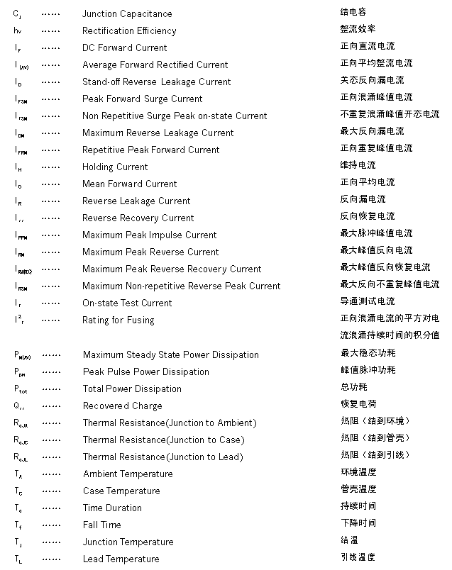 VBO …… Breakover Voltage 轉(zhuǎn)折電壓 VC …… Clamping Voltage 箝位電壓 VDC、 VR …… DC Reverse Voltage 反向