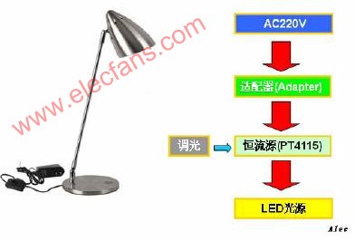 LED 臺(tái)燈一種簡(jiǎn)潔實(shí)用的方案如圖1 所示。AC220V 經(jīng)由適配器在燈具外的安
